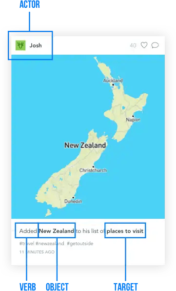 You'll notice that our example of "Josh (actor) added(verb) New Zealand (object) to his list of places to visit (target)" follows the spec. Feeds can be more complex and have many custom fields.