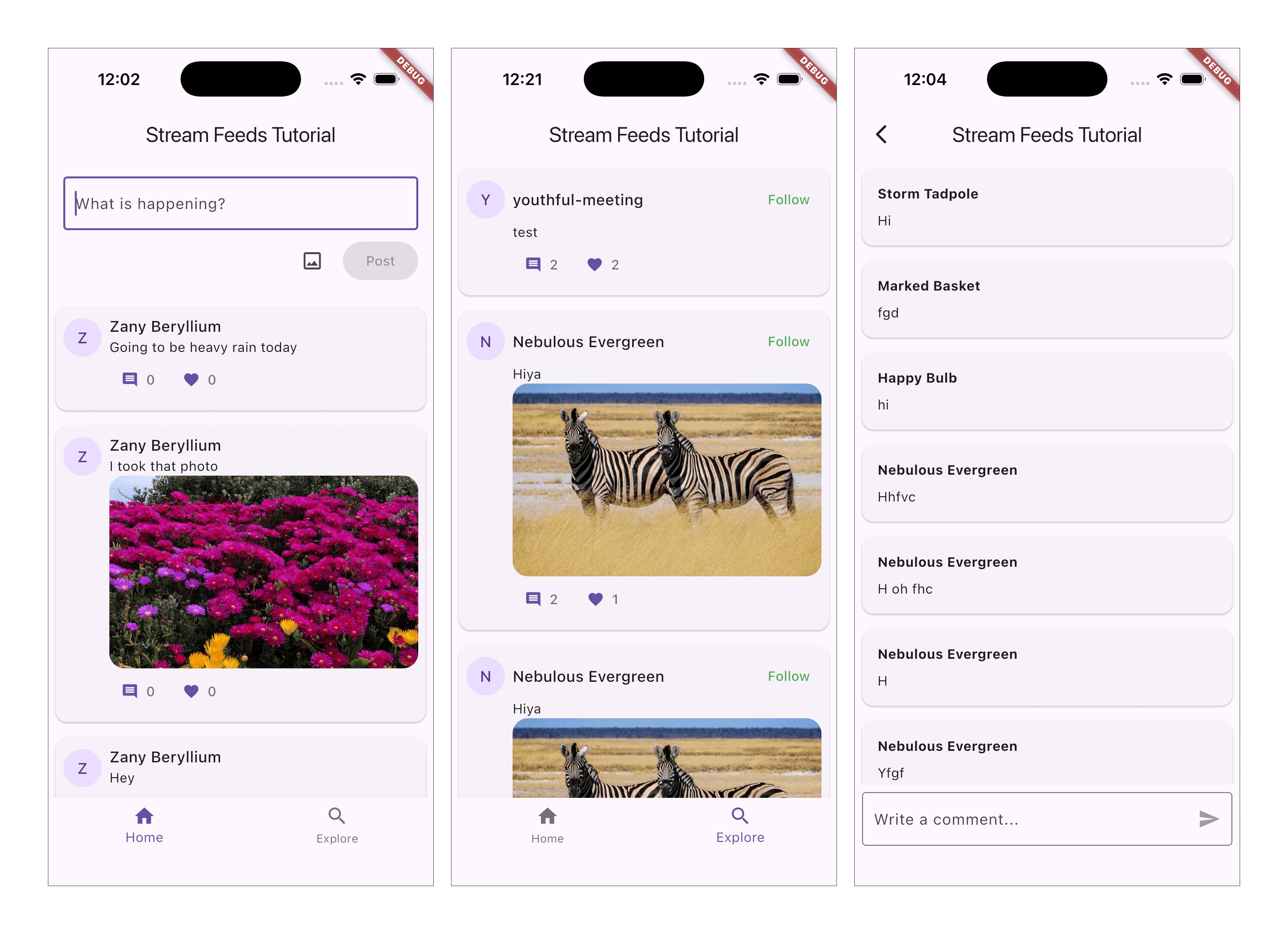 1234567891011121314151617181920212223242526272829303132333435363738Widget build(BuildContext context) { if (isLoading) { return Center(child: CircularProgressIndicator()); } return Scaffold( appBar: AppBar(title: Text('Stream Feeds Tutorial')), body: _index == 0 ? Column( children: [ ActivityComposer(userFeed: userFeed), Expanded( child: ActivityListView( client: client, feed: timelineFeed, onFollow: onFollow, onUnfollow: onUnfollow, ), ), ], ) : ActivityListView( client: client, feed: exploreFeed, onFollow: onFollow, onUnfollow: onUnfollow, ), bottomNavigationBar: BottomNavigationBar( items: [ BottomNavigationBarItem(icon: Icon(Icons.home), label: 'Home'), BottomNavigationBarItem(icon: Icon(Icons.search), label: 'Explore'), ], currentIndex: _index, onTap: (index) => setState(() => _index = index), ), ); }