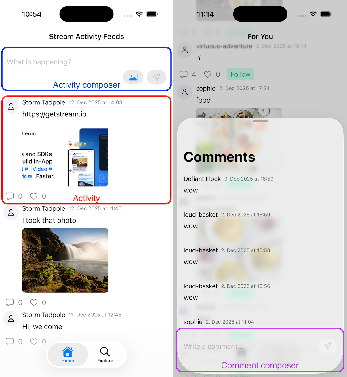 12345678910111213141516171819202122232425262728293031323334353637383940414243import StreamFeeds import SwiftUI struct RootView: View { @Environment(\.feedsClient) var client @State private var isConnected = false var body: some View { VStack { if isConnected { TabView { Tab("Home", systemImage: "house") { HomeView( timeline: client.feed( group: "timeline", id: client.user.id ) ) } Tab("Explore", systemImage: "magnifyingglass") { ExploreView( feed: client.feed( group: "foryou", id: client.user.id ) ) } } } else { ProgressView("Connecting to the Stream API") } } .task(id: client.user.id) { do { try await client.connect() log.info("✅ User \(client.user.id) connected successfully") isConnected = true } catch { log.error("Failed to connect", error: error) } } } }