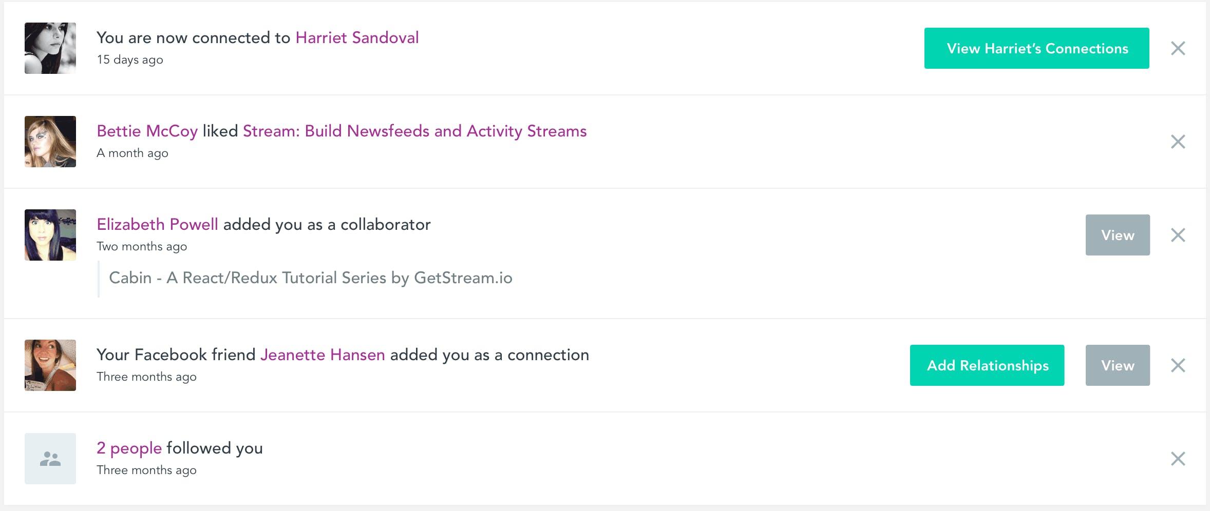 Based included Notification Feeds that are easy to drop into your app. These are great to include in Dashboards or roll-ups that display information about recent activity. Following the history of an object or user can provide great context into the activity of your app and allows you to quickly catch up on what has happened since you last logged in.