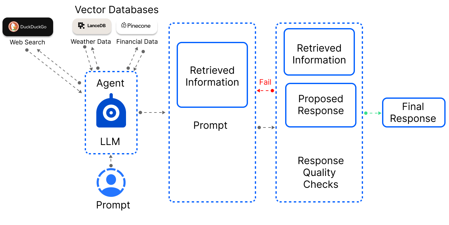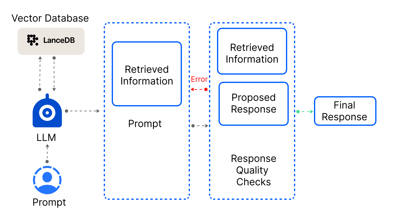 In the diagram above, the response quality control loop (Response Quality Checks) ensures that the LLM retrieves only accurate information from the knowledge base.