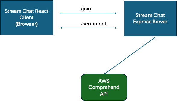 On the left side, we have Stream Chat, the frontend and a React client, which runs in the browser. This client connects to the Stream Chat Express server. The Stream Chat server is an Express REST-based application that runs on Node. It exposes two endpoints, one for joining the chat and another for getting the sentiment of a message. This server queries the AWS Comprehend service whenever a message arrives to get a sentiment evaluation. There are four possible values: Positive, for a positive sentiment, negative for a negative sentiment, neutral and mixed for a sentiment that is a bit of both.
