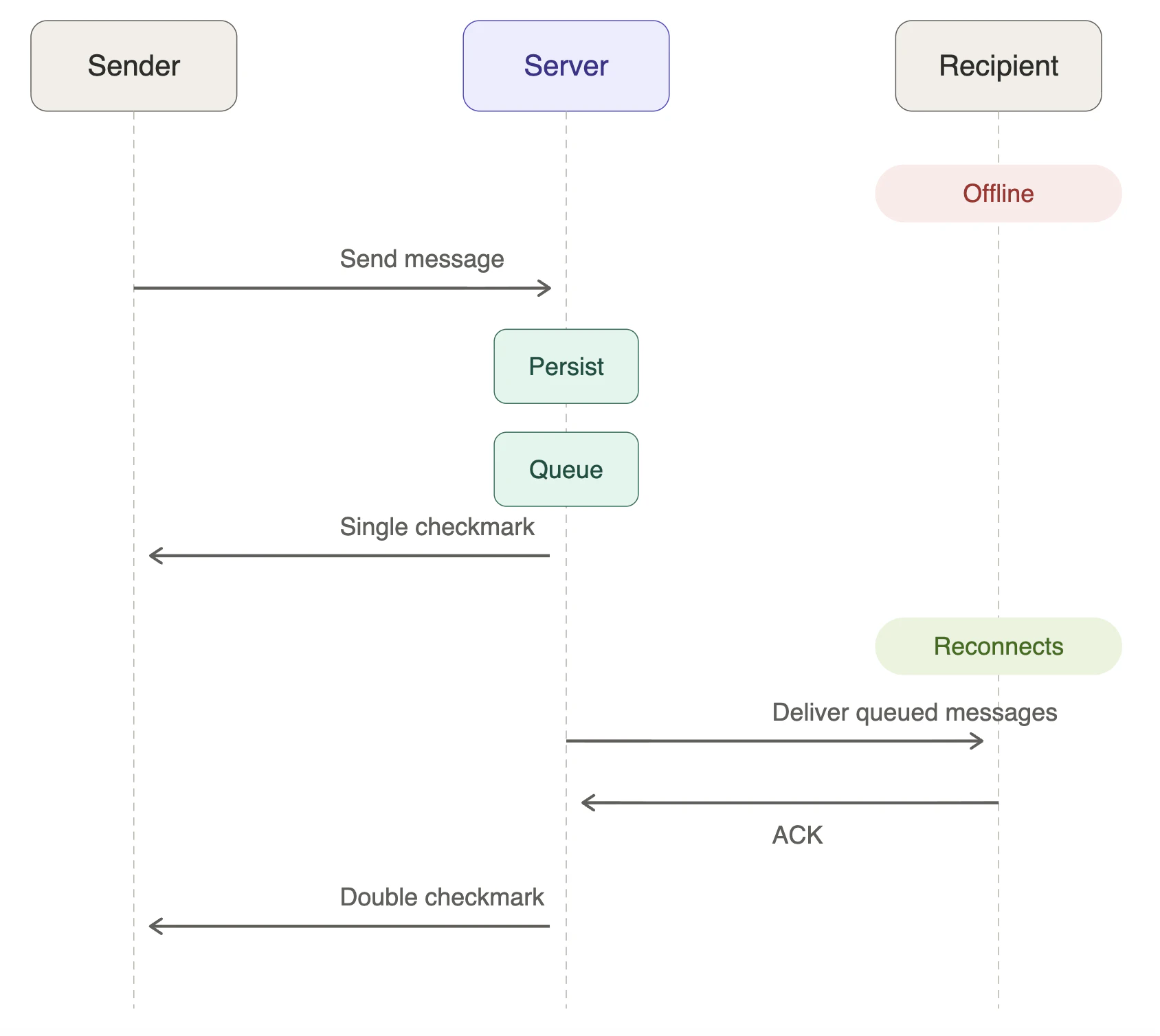 When a message arrives, and the recipient is disconnected, the server stores it in a delivery queue. The sender sees a single checkmark (server received). When the recipient reconnects, queued messages are delivered, the recipient's client sends an acknowledgment, and the sender sees a double checkmark. This is the store-and-forward pattern WhatsApp pioneered.