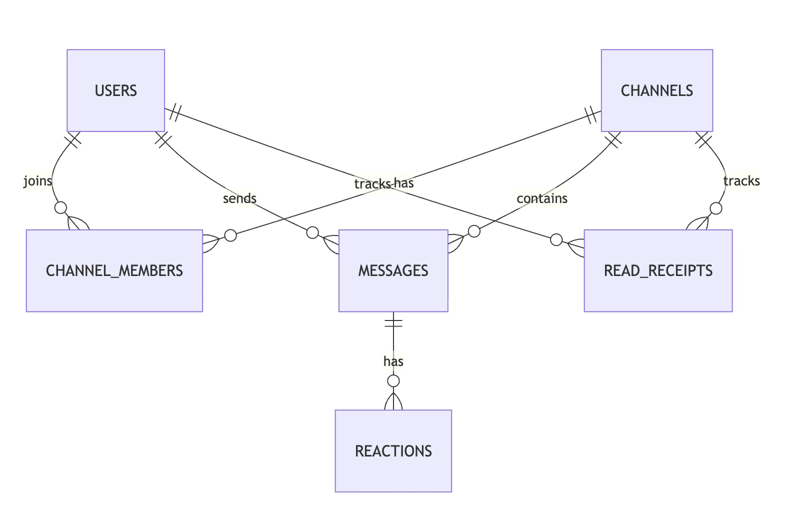 read_receiptstable stores each user's last-read message per channel, which underpins unread counts. reactionsuse aUNIQUE(message_id, user_id, emoji)constraint so a user can add each emoji at most once per message.