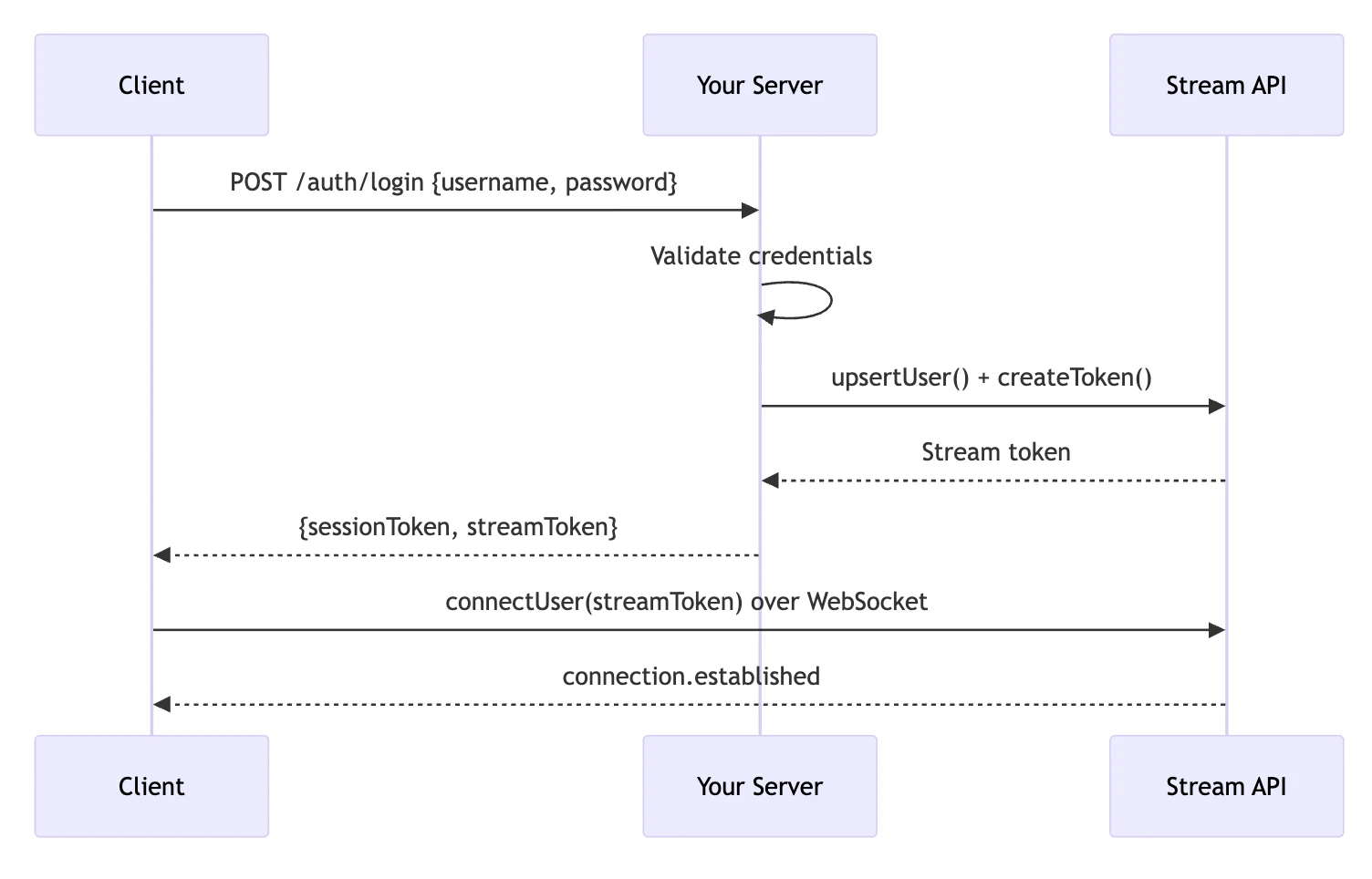 Stream handles token validation, WebSocket authentication, rate limiting, and token refresh internally. You only manage the initial token generation on your server.