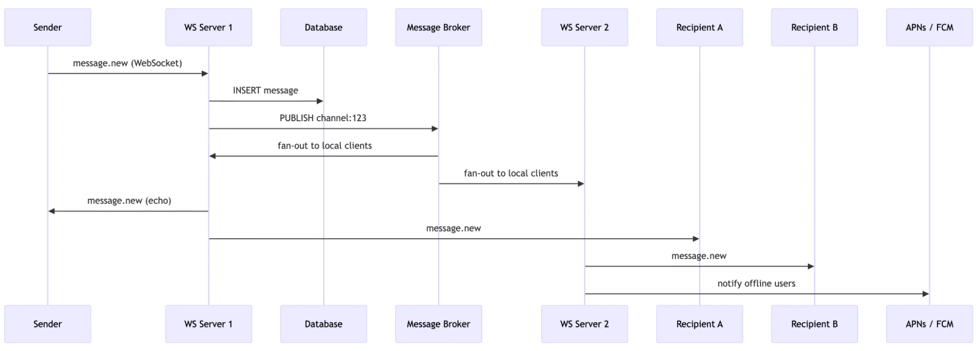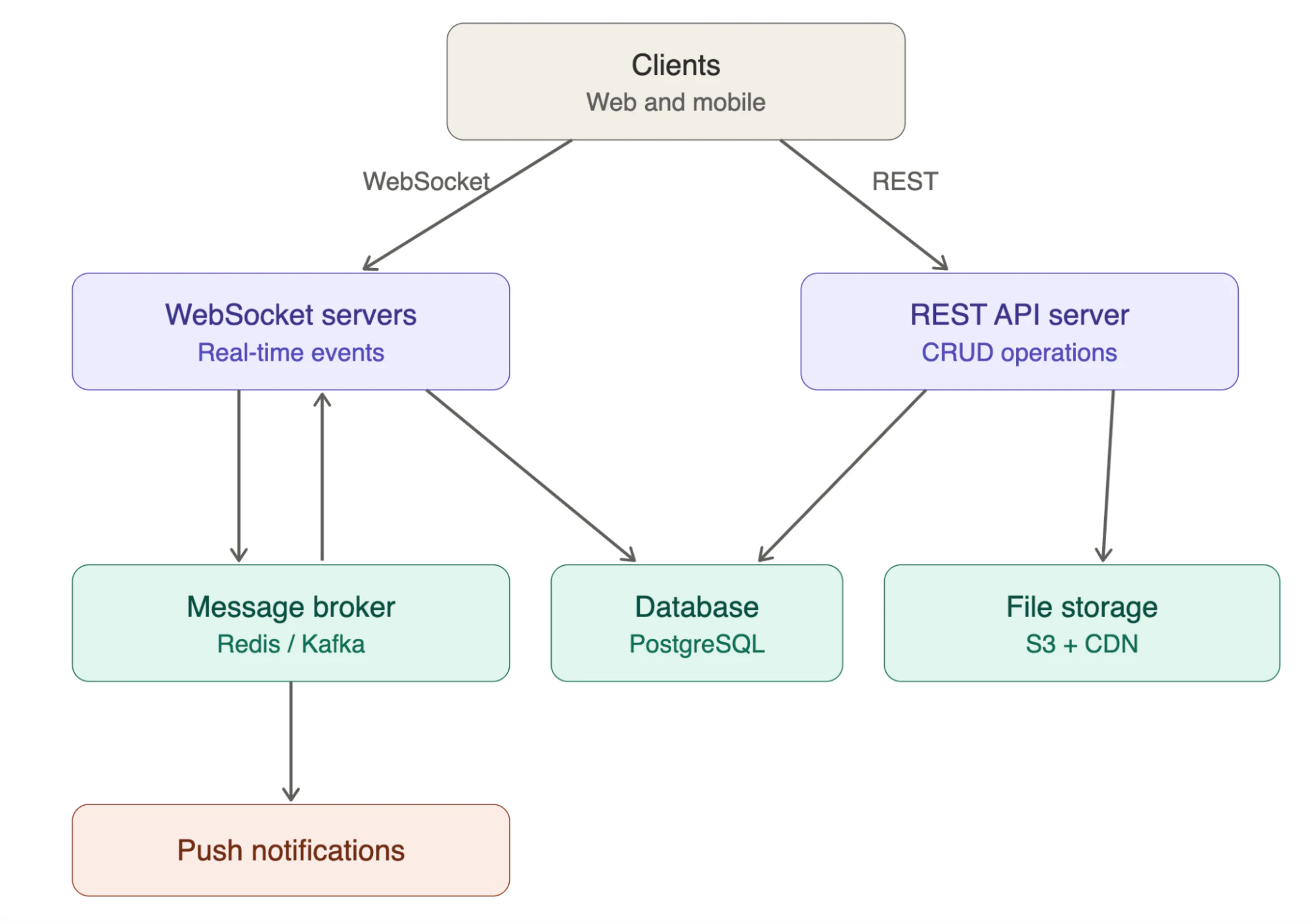 - Message broker (Redis Pub/Sub, Kafka, NATS) routing messages between WebSocket server instances