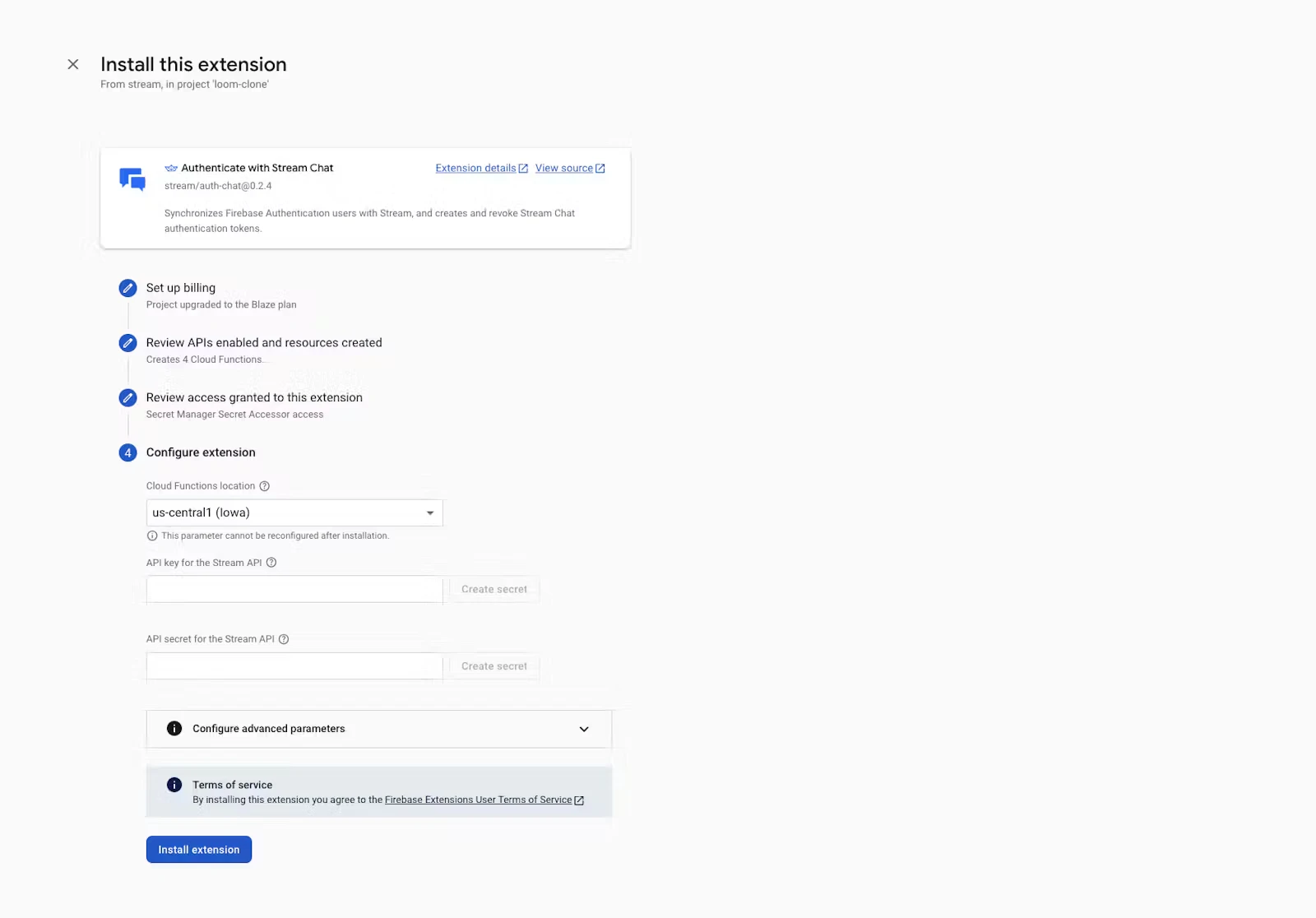 Finally, enter your Stream API key and secret in the configuration fields, then click the Install Extension button.
