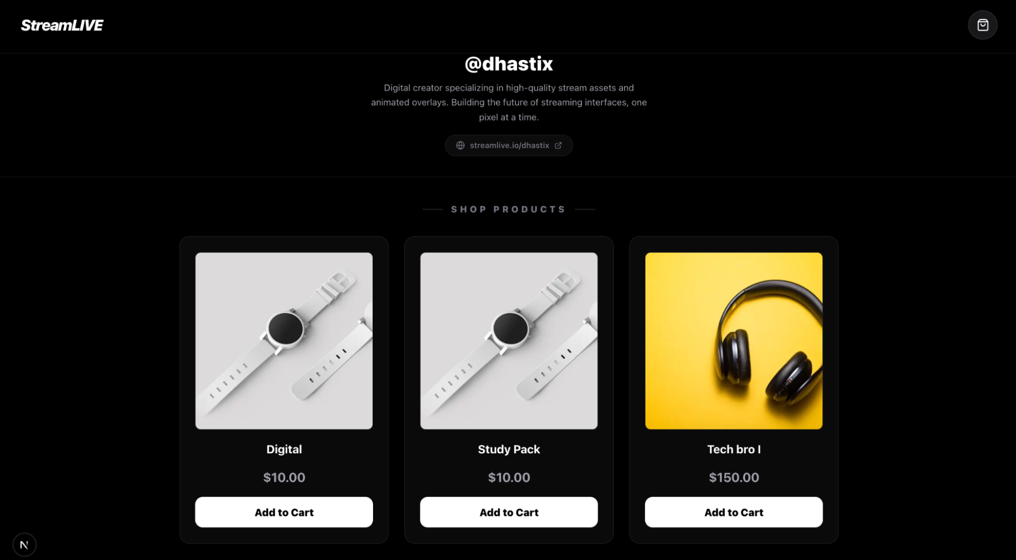Found at /shop/[username]/products, this page represents the streamer’s shop, where users can browse and purchase products.
