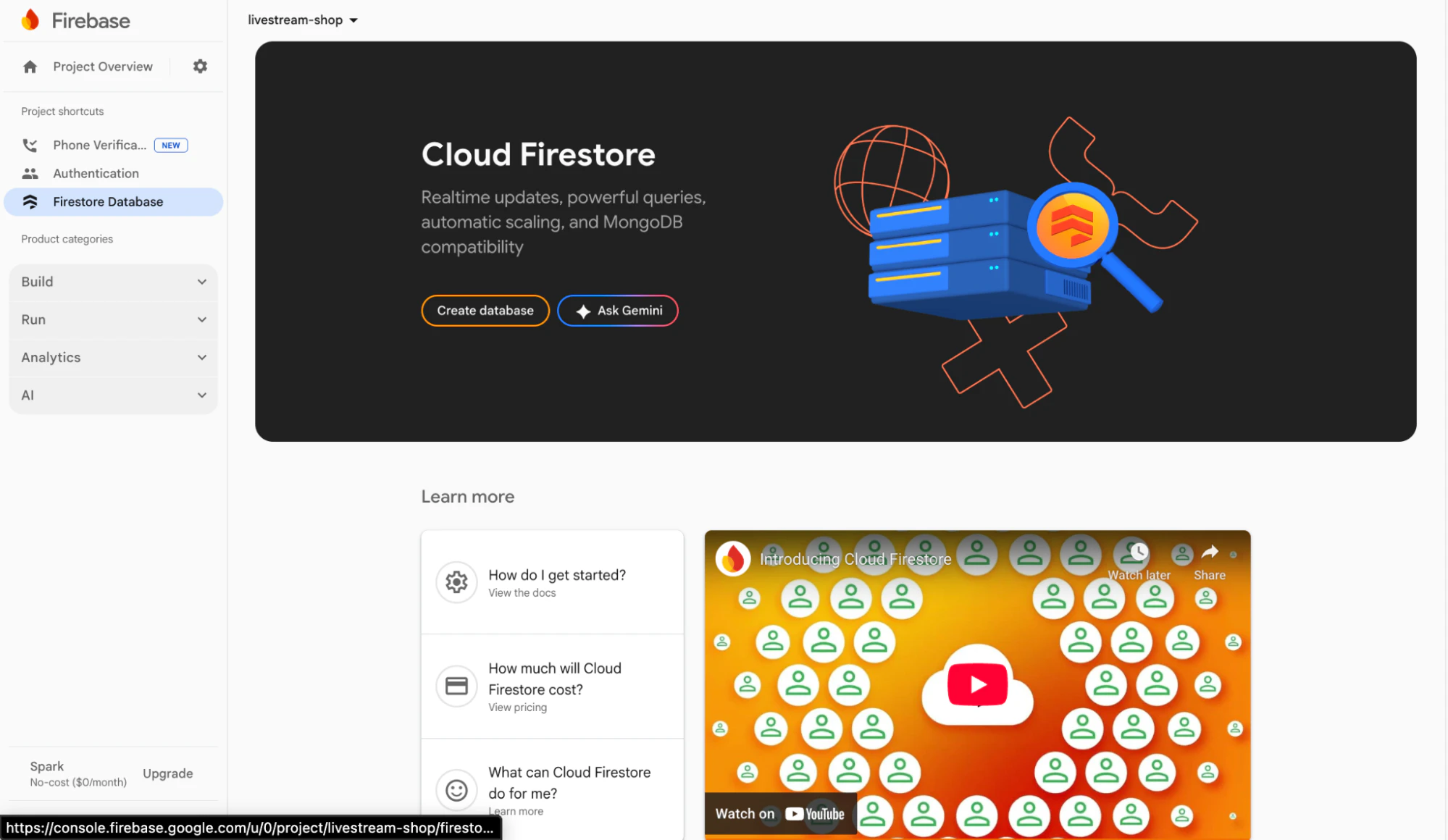 Next, select Authentication and Firestore Database from the sidebar menu and add them to the project.