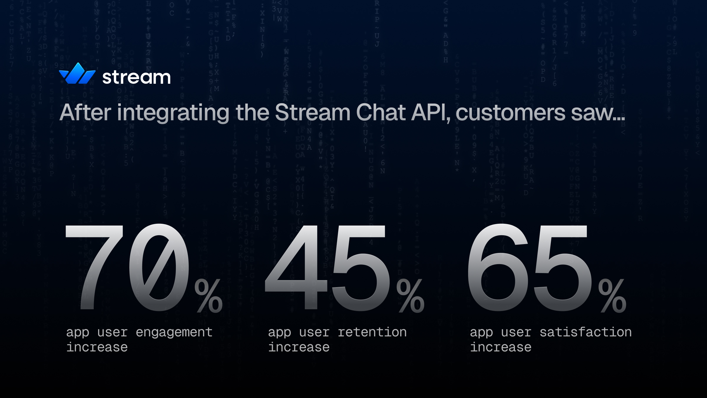 The results from the Chat Customer Survey represent Stream’s ongoing commitment to build API and SDK solutions to elevate the quality of your app. Thanks to intuitive SDKs and globally scalable API infrastructure, our customers are seeing quantifiable improvements to their most important app metrics.
