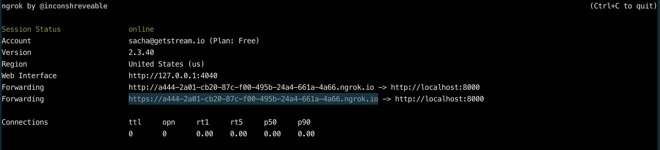 The objective of this tutorial is to learn how to leverage Stream webhooks to react to events in your app and act accordingly. For development purposes (and to simplify this article), we won’t deploy our webhook. We’ll use a tunneling service instead. But, keep in mind that in production you will have to deploy your webhook server at some point.