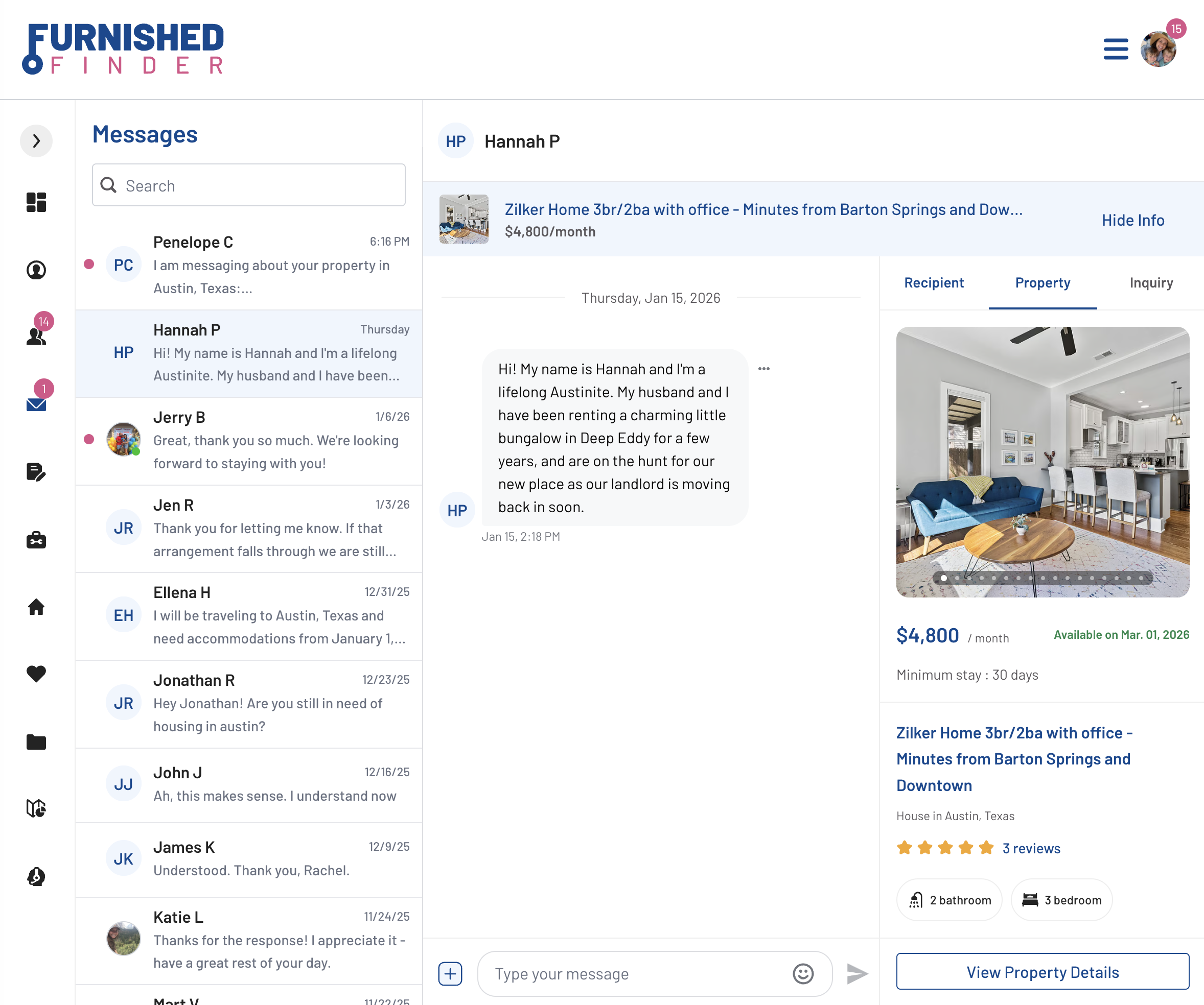 With Stream Chat fully embedded, messaging has become a foundational part of the Furnished Finder platform.