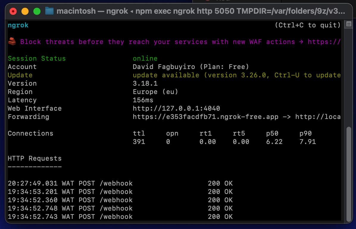 Second, you have to open a new terminal different from the above to start Ngrok. Before you continue to run the application, you can copy the commands below to run the server.