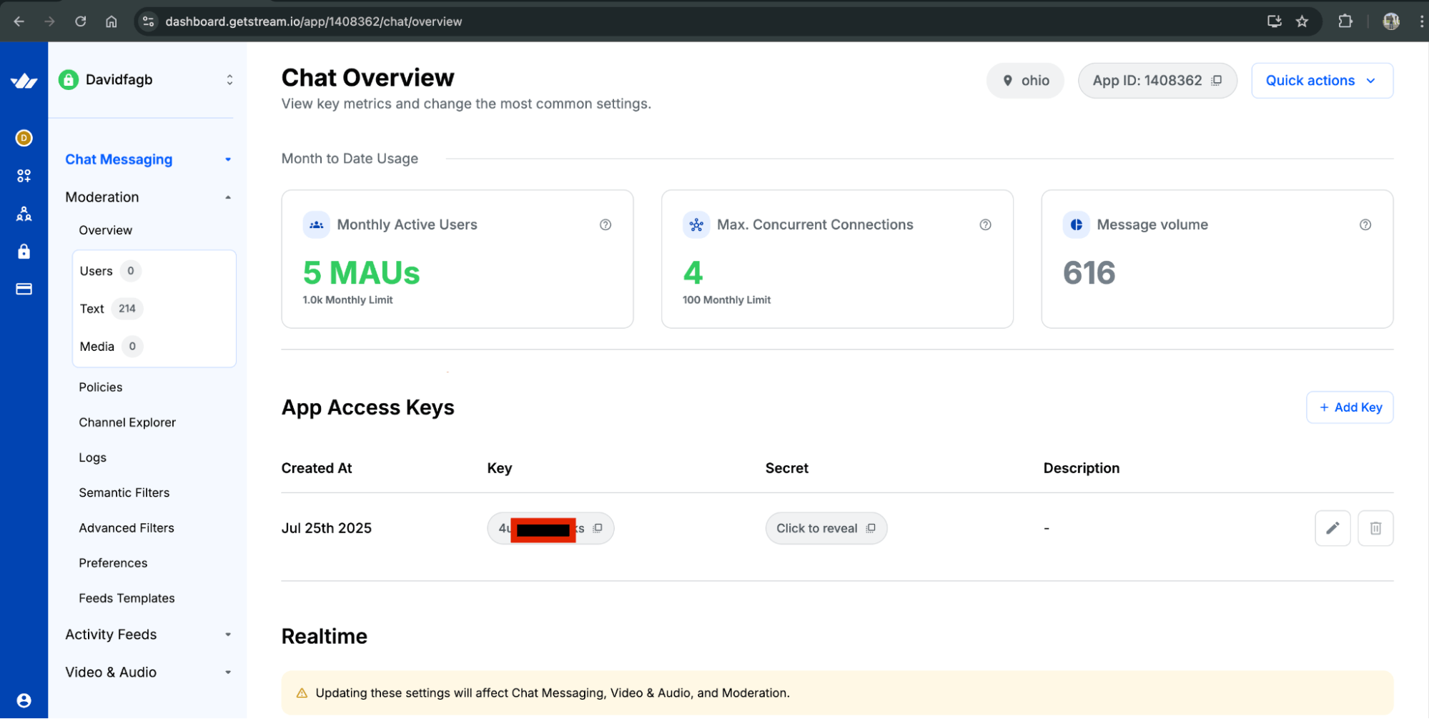 Now that your project is set up, the next step is configuring Stream and enabling the AI moderation features. Create your free account to log in to your Stream dashboard and create a new application. You'll find your API key and secret in the app's settings.