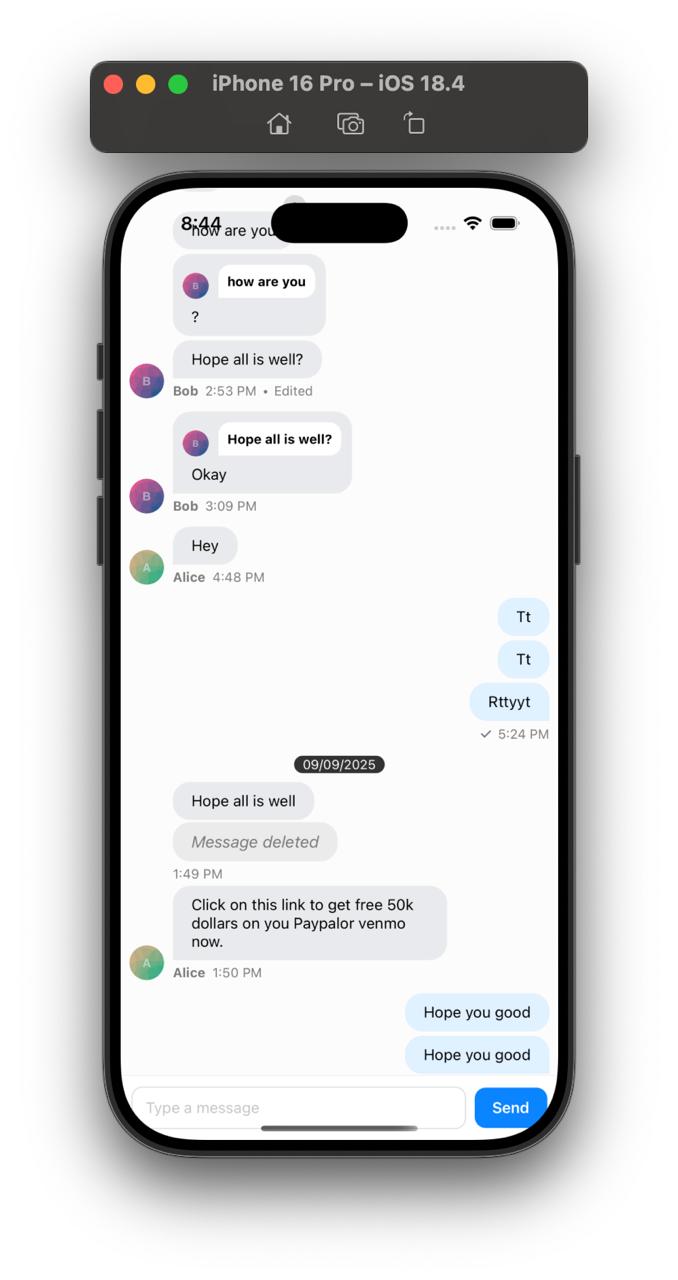 Once in the app, log in as Alice or any of the other seeded users. To start a new chat, tap on a new group, select at least two users from the list, and then tap create. You can now begin chatting within the new group.