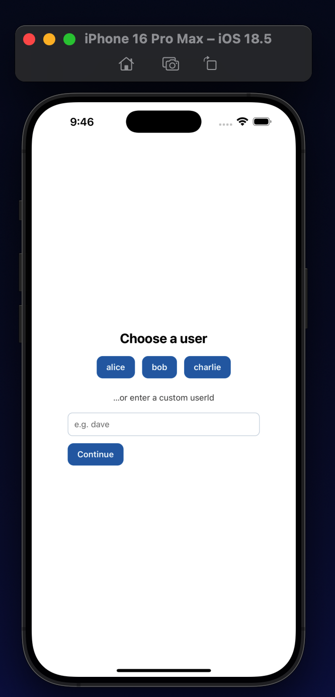 To run the app, launch it on either an iOS Simulator by pressing “i” or an Android Emulator by pressing “a”. The token server URL is already set by default for both: http://10.0.2.2:5050 for Android and http://127.0.0.1:5050 for iOS.