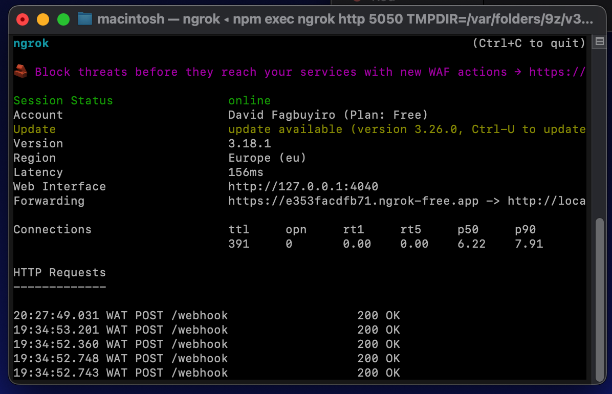 Second, you have to open a new terminal different from the above to start Ngrok. Before you continue to run the application, you can copy the commands below to run the server.