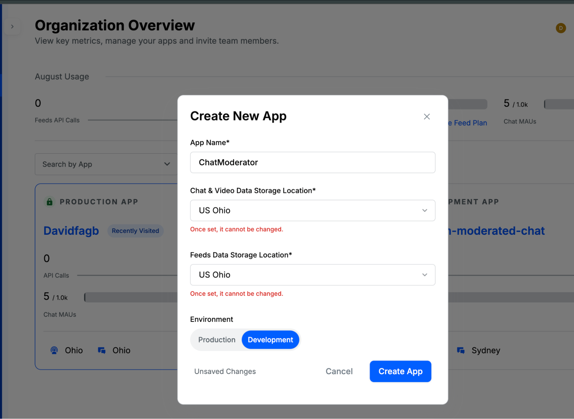 Now that your project is set up, the next step is configuring Stream and enabling the AI moderation features. Create your free account to log in to your Stream dashboard and create a new application. You'll find your API key and secret in the app's settings.