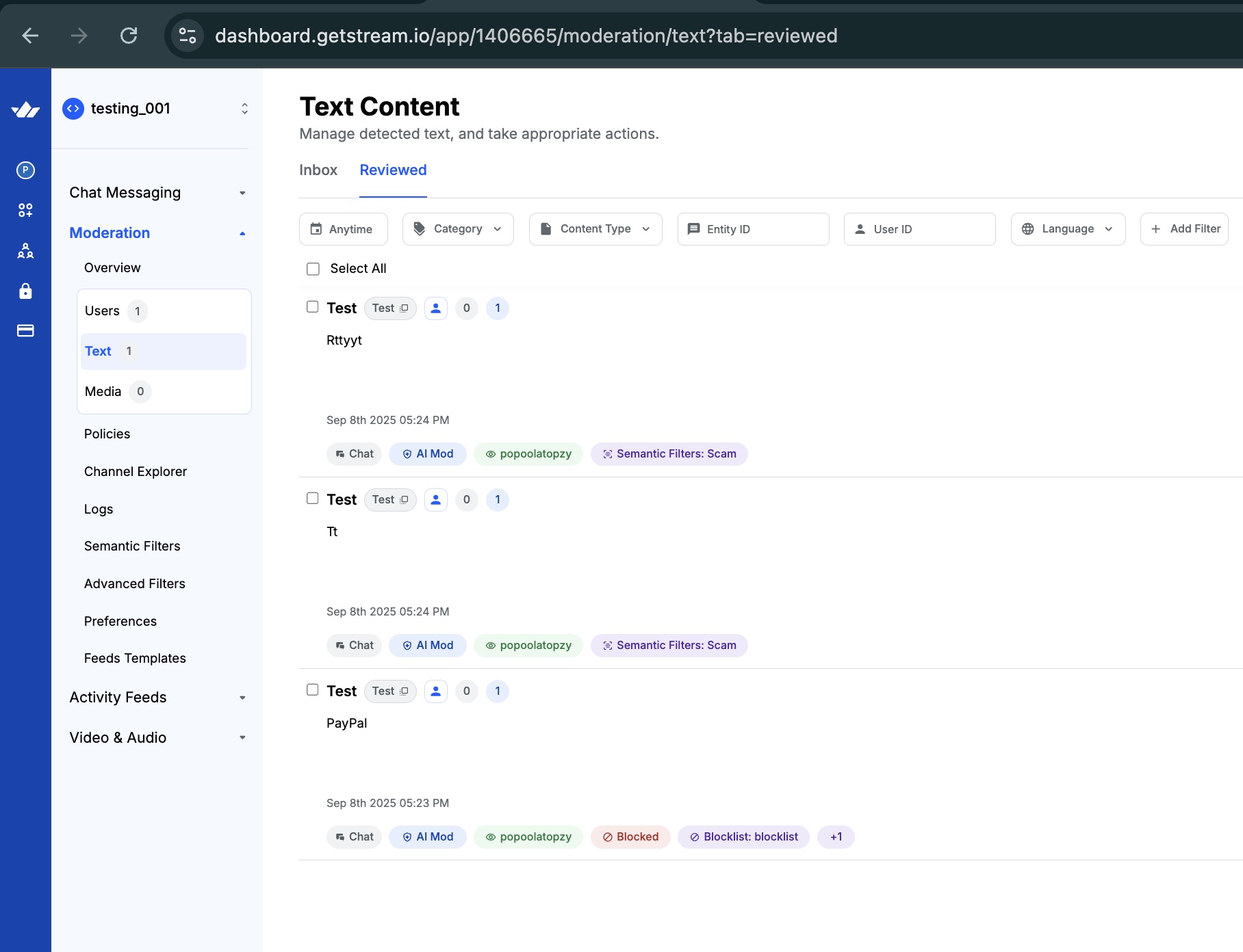 You should see that these messages are automatically blocked and not visible to other users in the chat, as shown in the short video below and in the Stream Moderation dashboard screenshot.