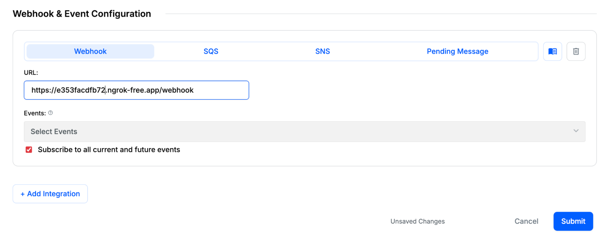 Copy the \https://e353facdfb71.ngrok-free.app/webhook\ URL and paste it in your Stream webhook event and configuration. Make sure you tick the box that says “subscribe to all current and future events” and click submit to save the webhook, as seen in the screenshot below.