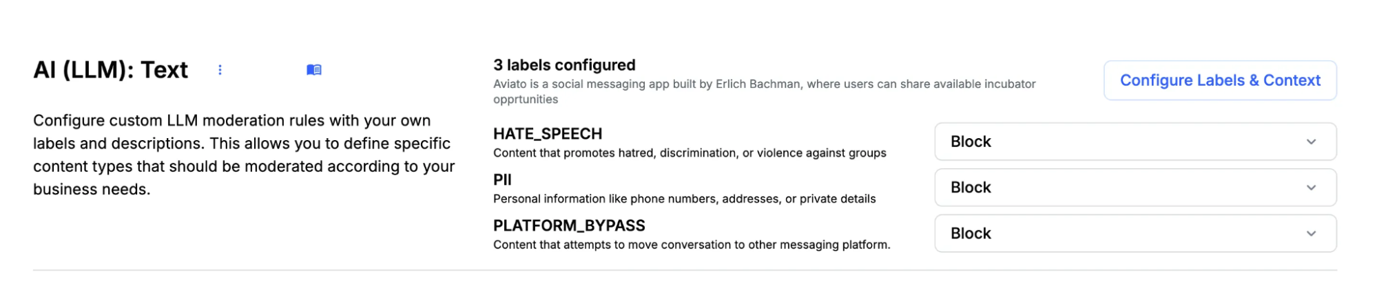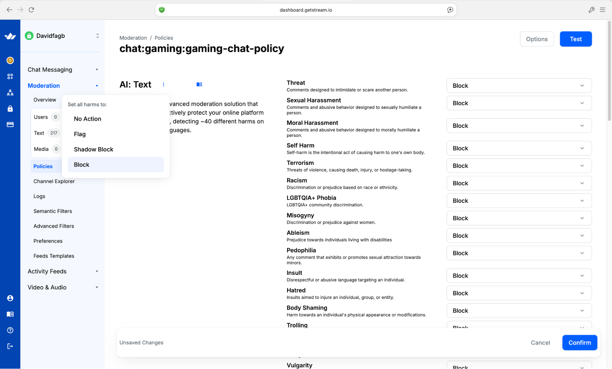 For each category, you can choose what should happen: flag the message, block it, or shadow block it. You can also change the sensitivity level for different types of harmful content. This helps you fine-tune moderation to match your community.