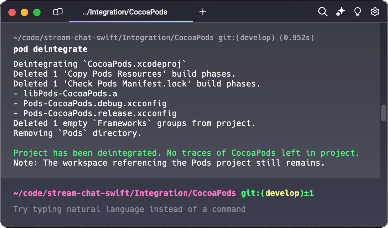 Now, let's remove CocoaPods from your project. You should run the command pod deintegrate in the same folder the Podfile is in.