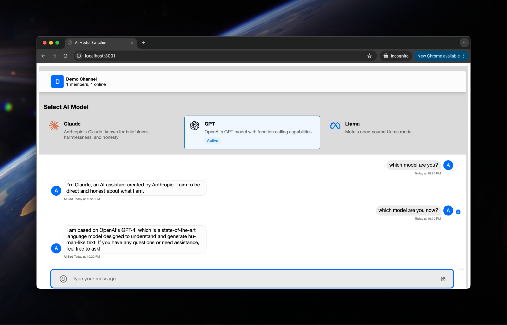 Stream's Chat API handles all the heavy lifting of real-time messaging, while our backend orchestration layer manages the complexities of model switching. The result is a chat experience that combines the best of multiple AI worlds – Claude's writing finesse, GPT's analytical prowess, and Llama's open-source flexibility – all within a single, cohesive interface.