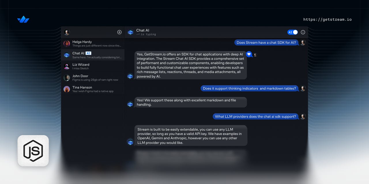 StreamChat’s NodeJS SDK, enables real-time chat features, essential for building modern, scalable messaging functionalities. We will use it to listen to all the messages in the channel, and send those to LLMs for AI generated responses.