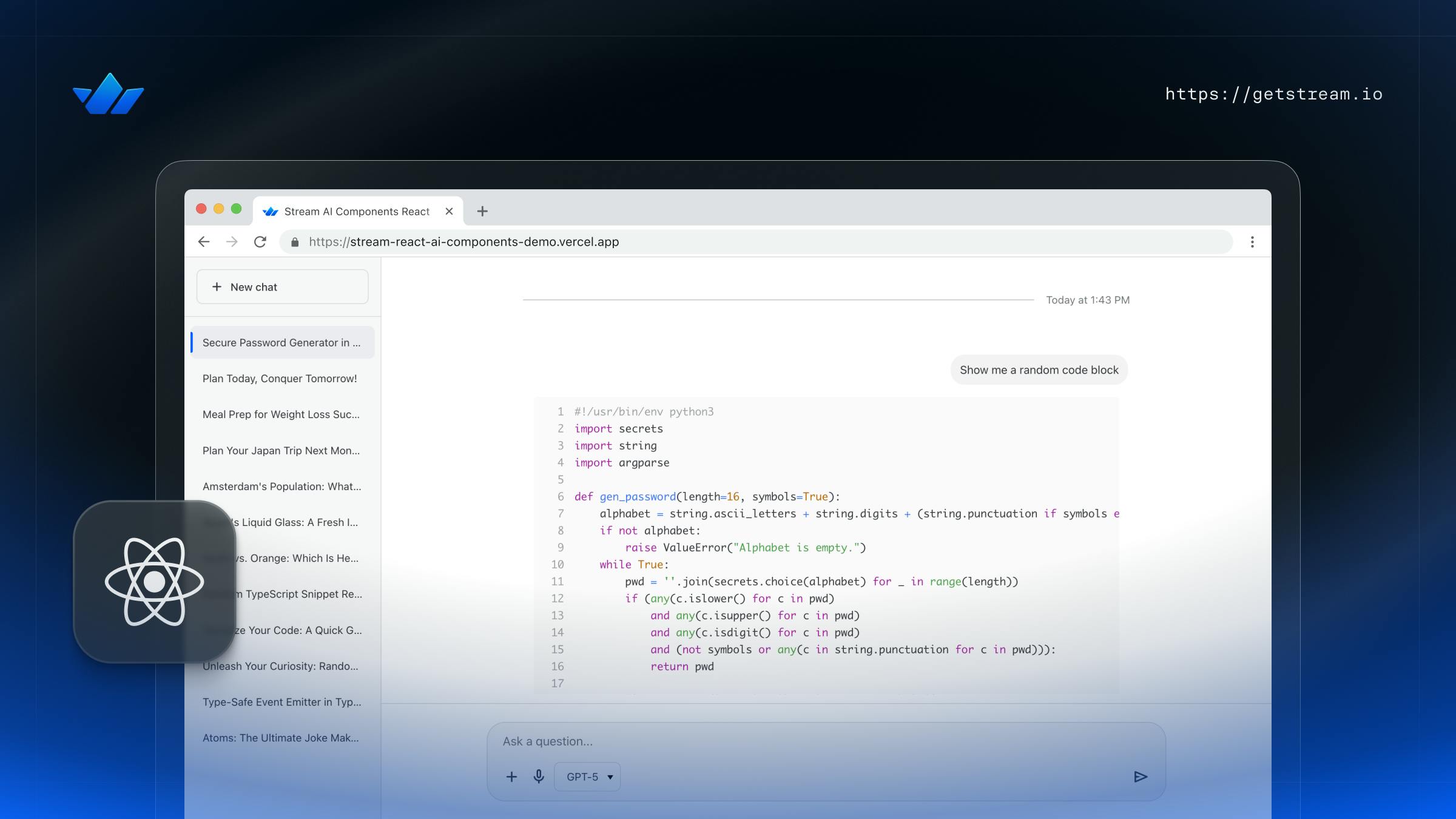 In this tutorial, we will demonstrate how easy it is to create an AI assistant for React using Stream Chat. As an example, we will leverage the StreamChat integration with Vercel's AI SDK; however, developers are free to use whichever LLM provider they like and still benefit from Stream's rich UI support for Markdown, tables, code samples, charts etc. To follow along with this tutorial, we recommend creating a free account and checking out our main React Chat SDK tutorial as a refresher.