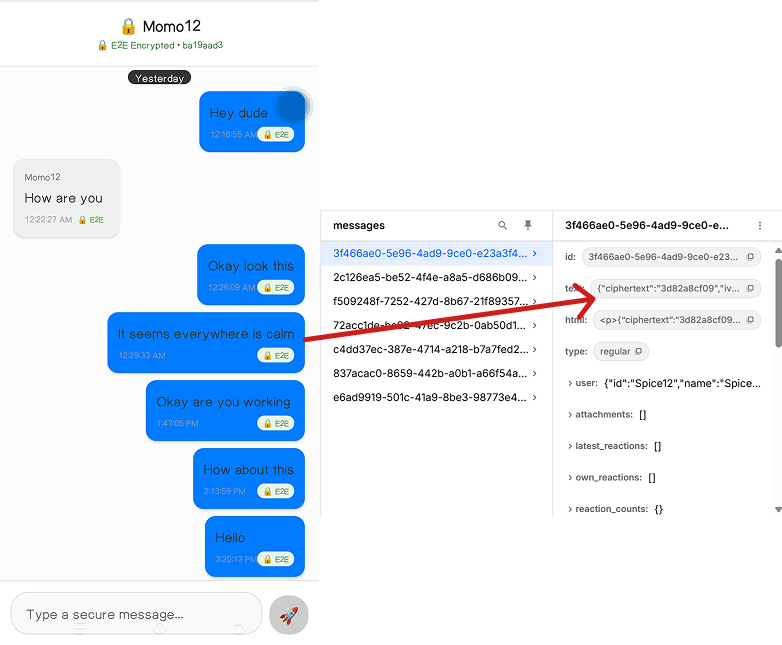 In the typical chat application we built earlier, the text sent between users is visible to the Stream server in plaintext. With E2EE applied, the server only relays encrypted payloads; it never sees message contents.
