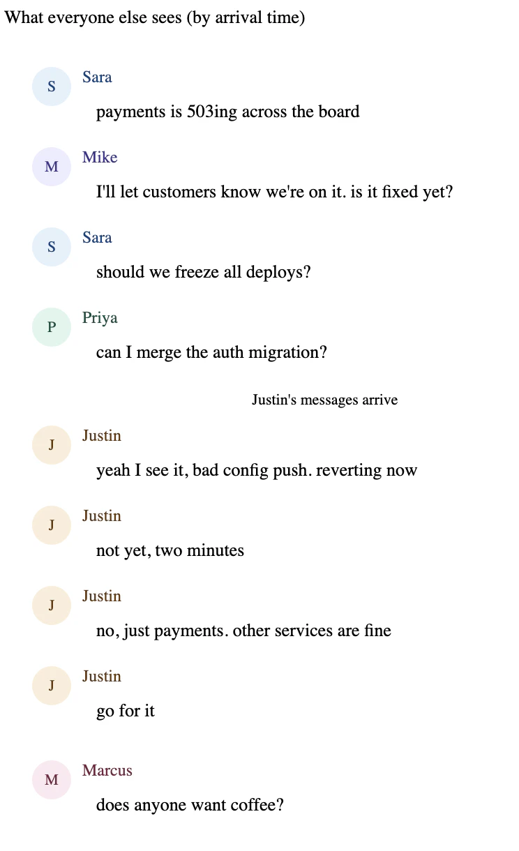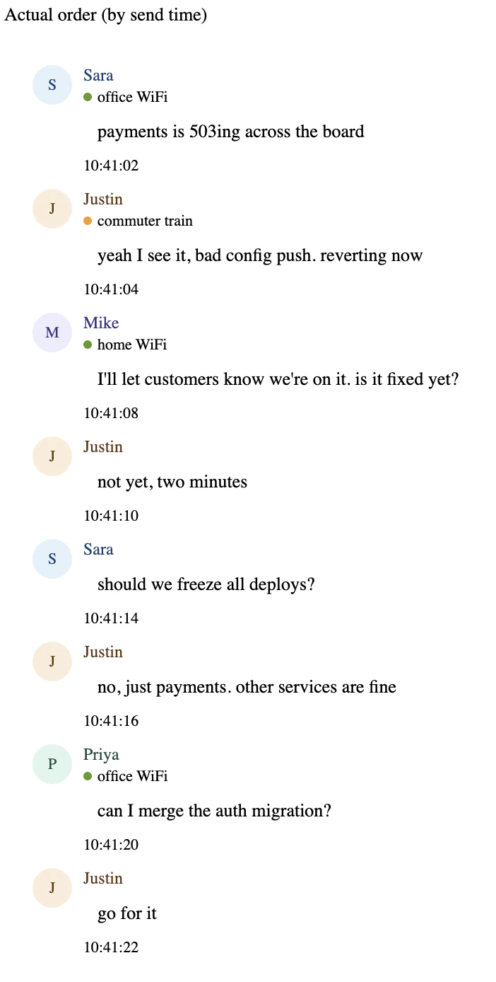 Justin is on a congested cellular connection from the train. His messages take 300-400ms to reach the server. Everyone else is on WiFi with sub-20ms latency. If the server sequences by arrival order, everyone else in the channel sees this: