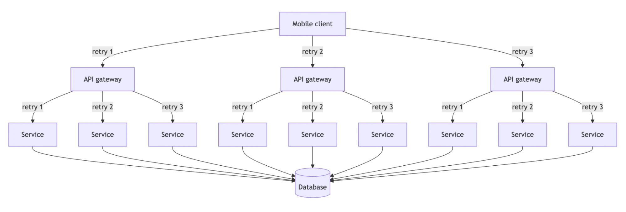 The deeper danger with retries is amplification. A backend with 5 layers, where each layer retries 3 times, turns a single failed request into 243 requests at the bottom of the stack. On mobile, the client adds yet another retry layer, and amplification starts before the request even reaches your infrastructure.