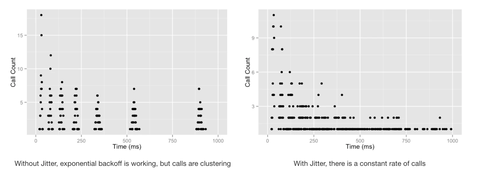 Exponential backoff helps, but not as much as you'd expect. AWS simulated 100 clients contending for the same resource and found that plain exponential backoff still produced clusters of retries, because every client backed off to the same intervals. The calls happened less frequently, but they still happened in spikes.