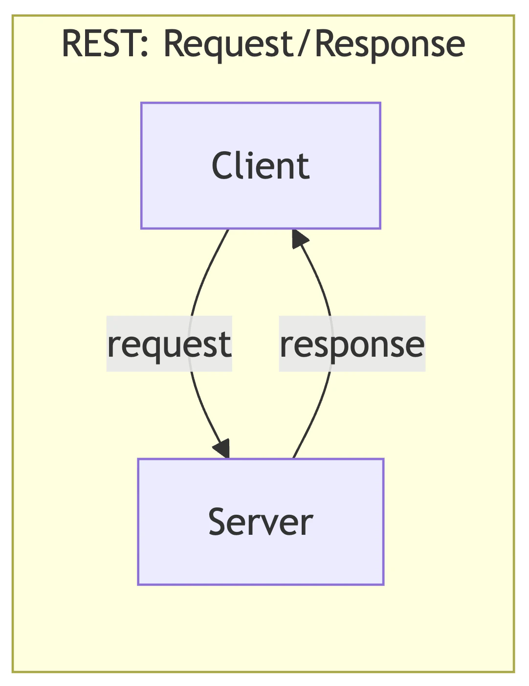 A standard REST API handles discrete request/response pairs. A client sends a request, the server processes it, and the connection closes.