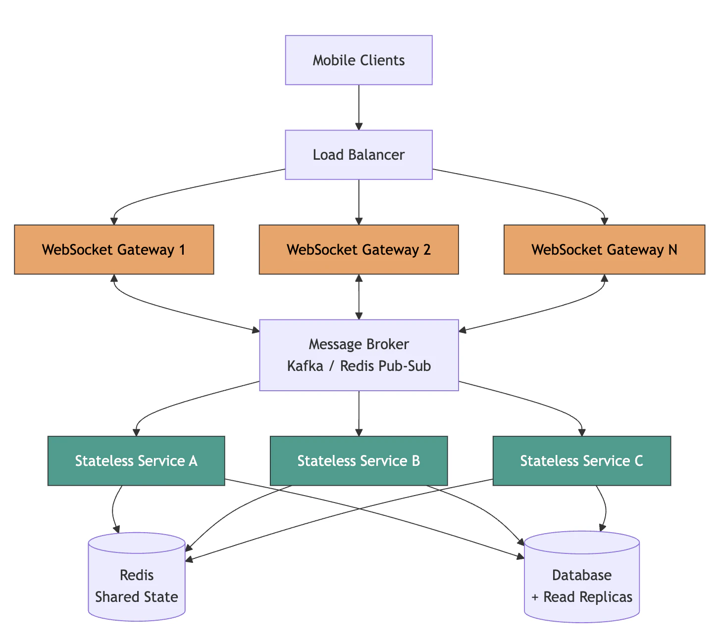 Stateless application logic behind a stateful connection layer. WebSocket connections are inherently stateful, but the business logic they serve doesn't have to be. A hybrid architecture with stateful real-time gateways and stateless backends lets the backend layer scale freely while the gateway layer manages connection affinity.