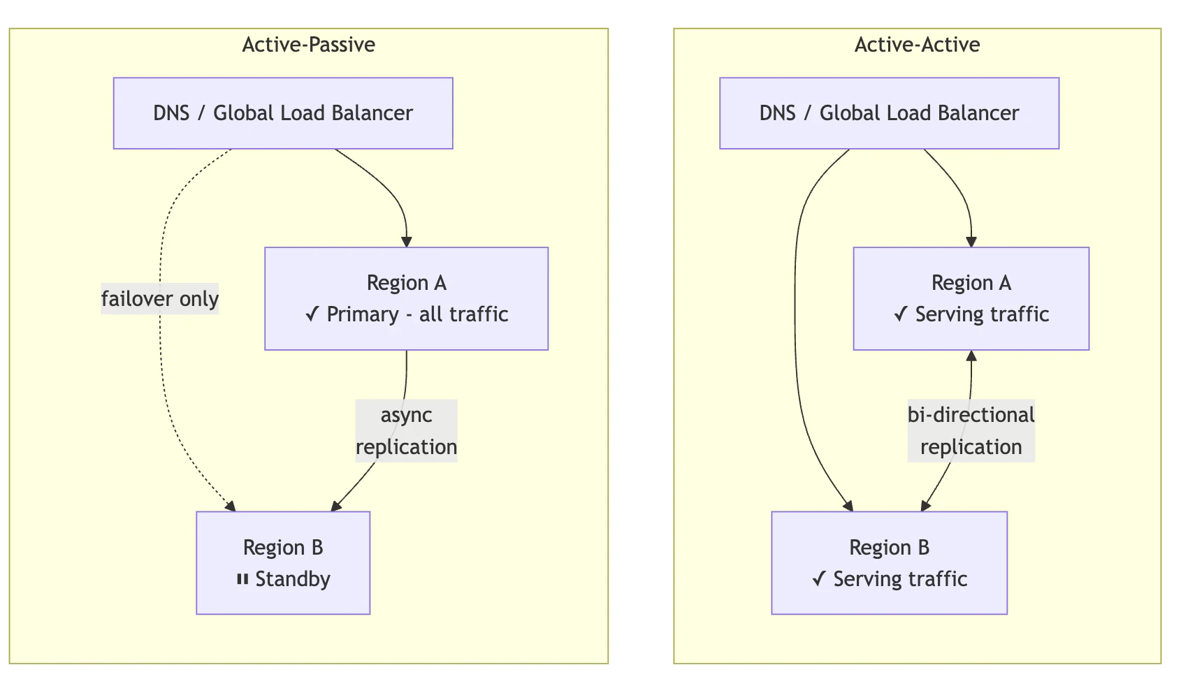 Active-passive designates one primary region for all traffic, with secondary regions on standby for failover. This is simpler and cheaper and avoids conflict resolution entirely. Still, recovery times during failover are longer, and the secondary region may not be fully warm when it needs to take over.