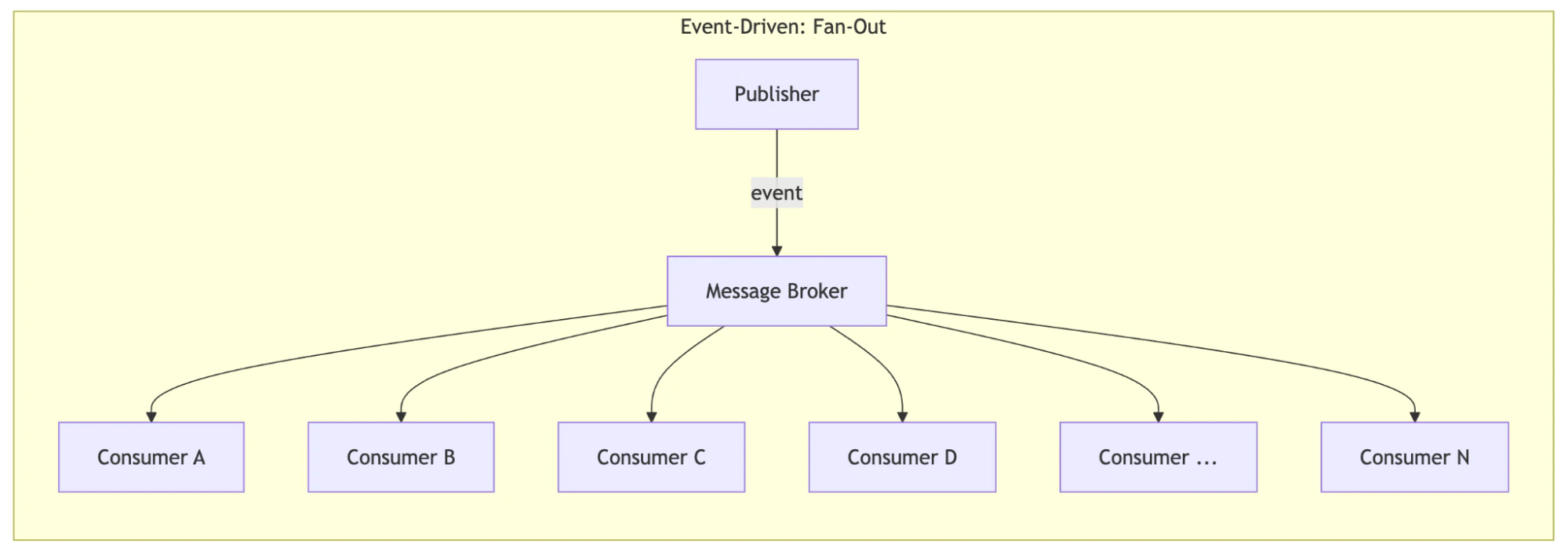 In a pub/sub system, a single published event can trigger delivery to hundreds or thousands of subscribers simultaneously. When a user posts a message in a group channel, the event is broadcast to every member's device. For example, an SNS-to-SQS fan-out on AWS distributes a single event to multiple independent queues, each processed by a different consumer.