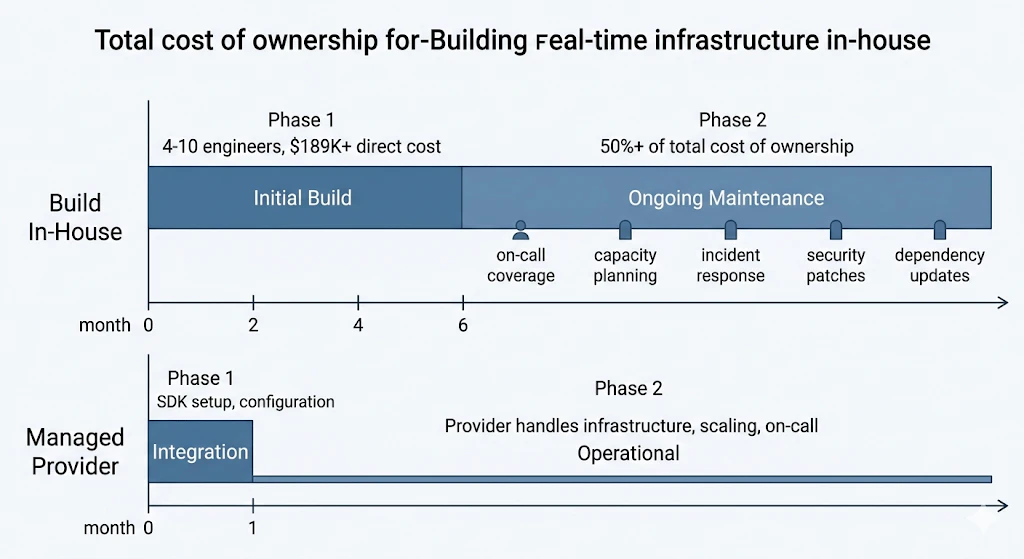 The decision framework is simple: build when real-time infrastructure is your product. When it's a means to an end, when your product is a chat experience, an activity feed, a live collaboration feature, the engineering time is better spent on the things your users actually see.
