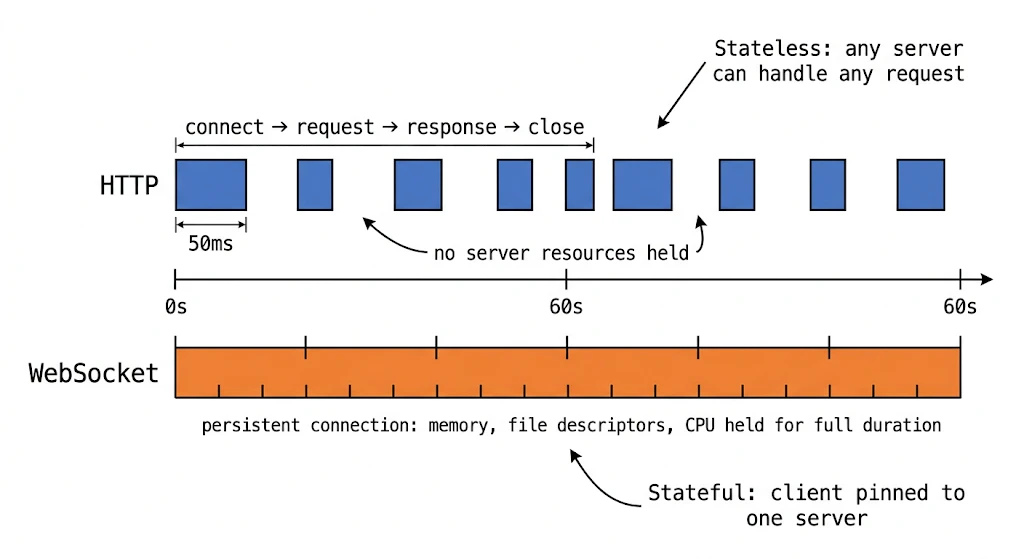 HTTP connections are short-lived and stateless. WebSocket connections are persistent, stateful, and full-duplex. Each one consumes memory, bandwidth, and CPU for the duration of the session, which can last hours or days.