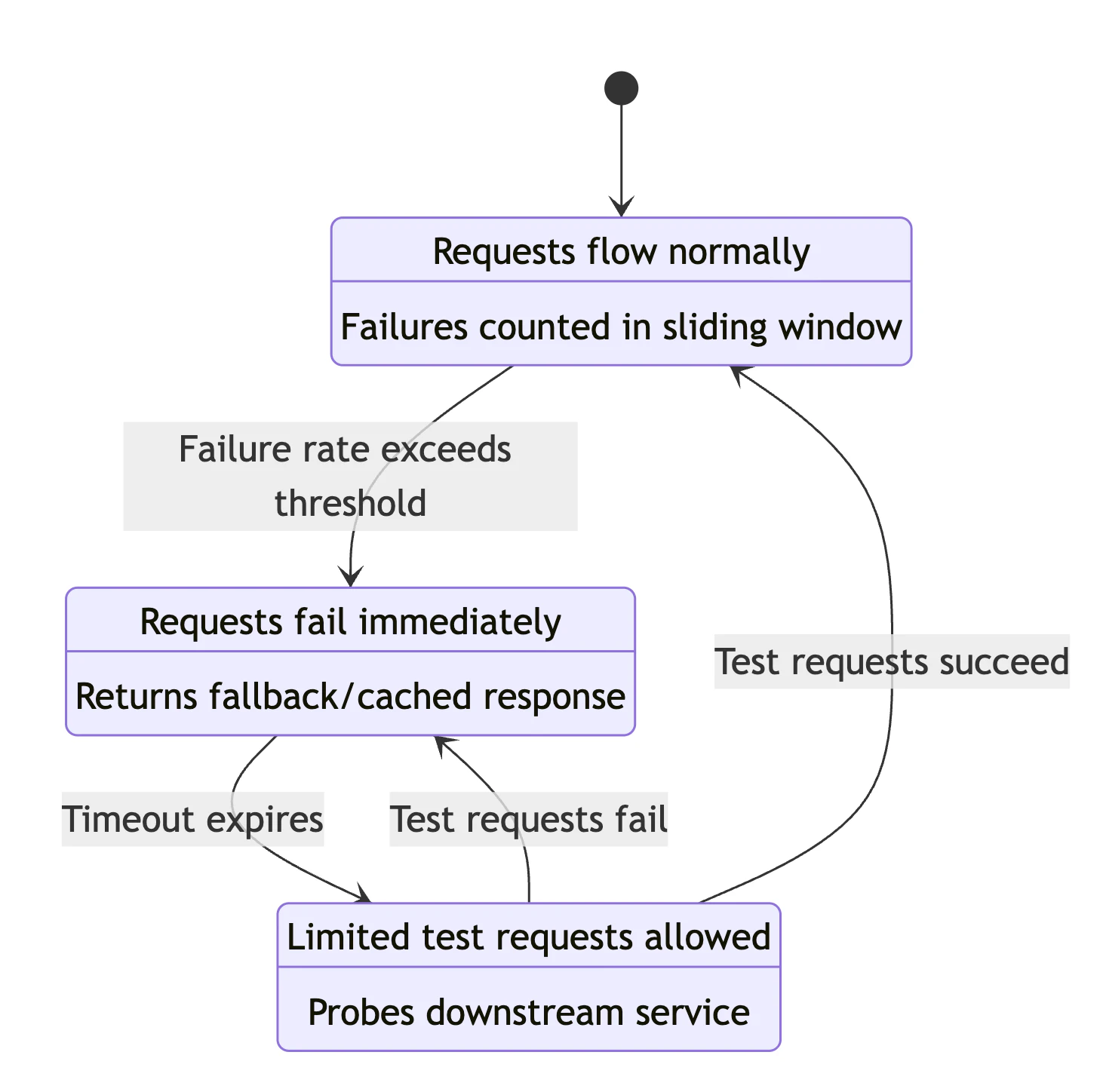 It works as a state machine. In the closed state, requests flow normally, and failures are counted. When the failure rate crosses a threshold (typically 50% within a sliding window), the breaker trips to open: requests fail immediately with a fallback response instead of waiting. After a timeout, it enters a half-open state, allowing a small number of test requests through. If they succeed, the breaker resets. If they fail, it reopens.