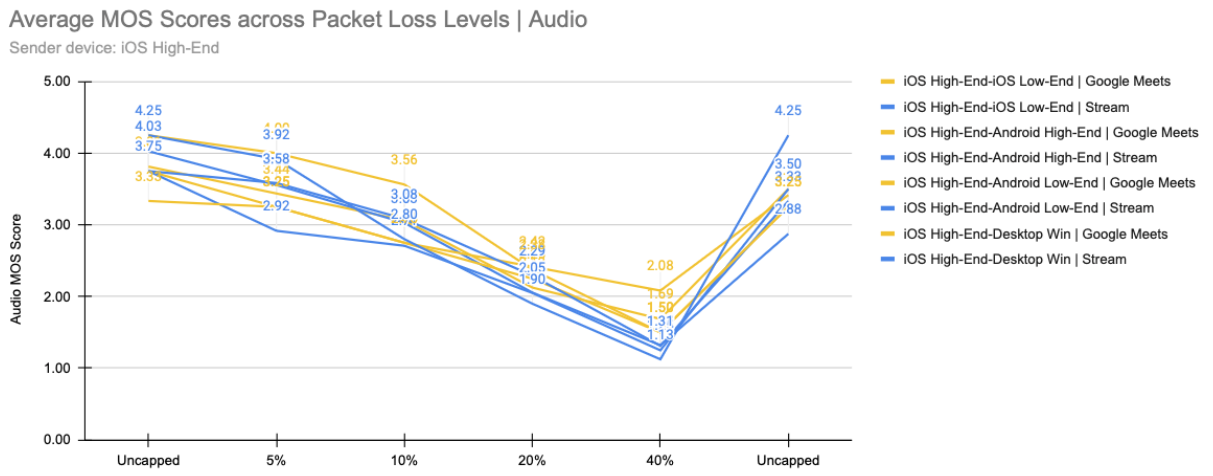 Here’s an example visual comparison of how the MOS value changes over time when we shift the packet loss, for both Stream and Google Meet.