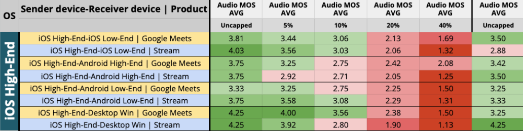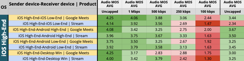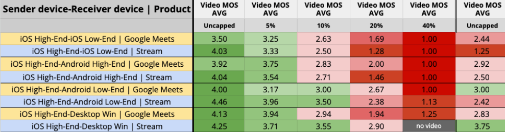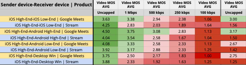 In the first column, you can see the different combinations of iOS devices as senders, and different receiving devices. The yellow rows show values for Google Meet, while the blue ones display values for Stream Video.