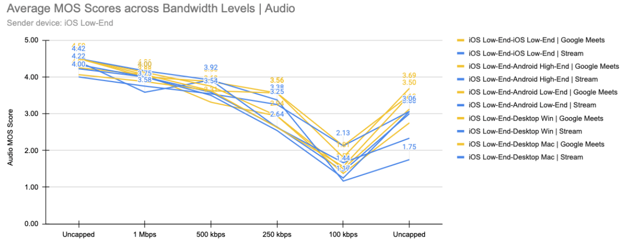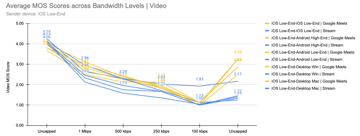 - 100 kbps - At the lowest bandwidth we used for testing, both MOS scores are low, but Google Meet has higher values across devices.