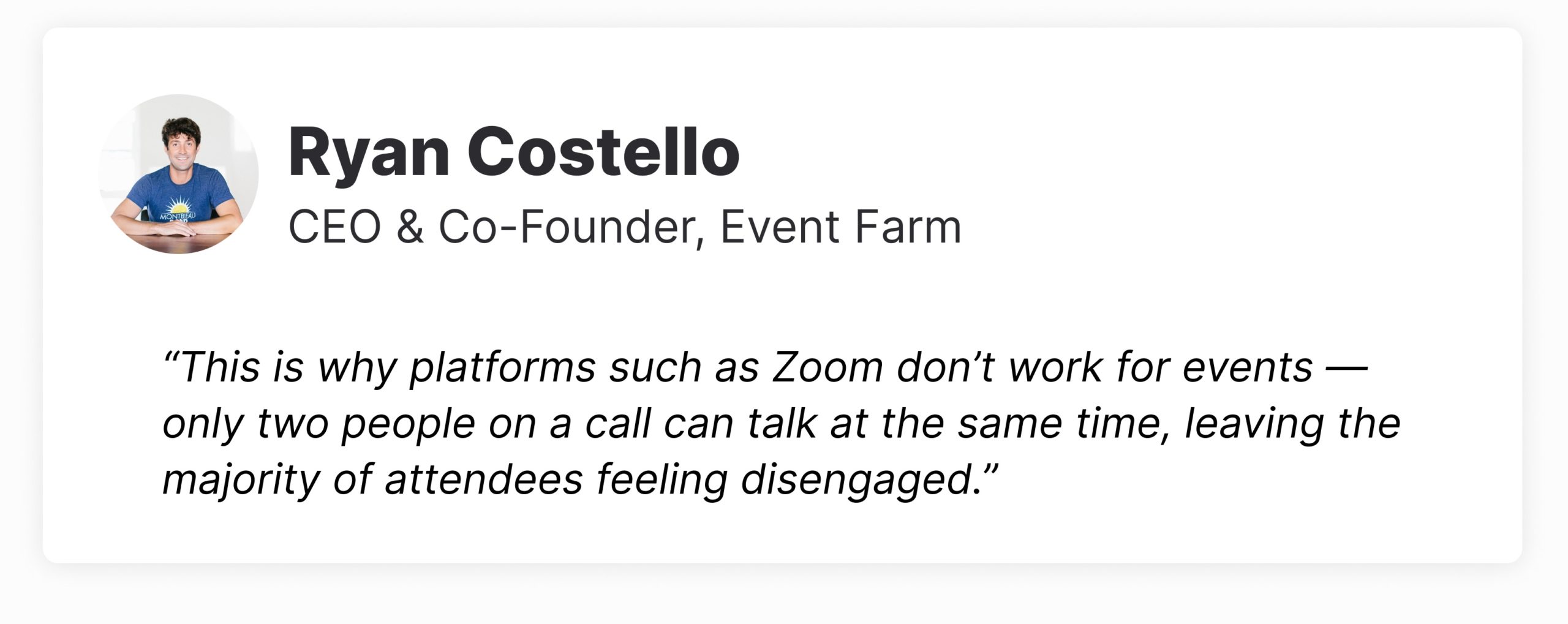 This is why platforms such as Zoom don’t work for events — only two people on a call can talk at the same time, leaving the majority of attendees feeling disengaged.