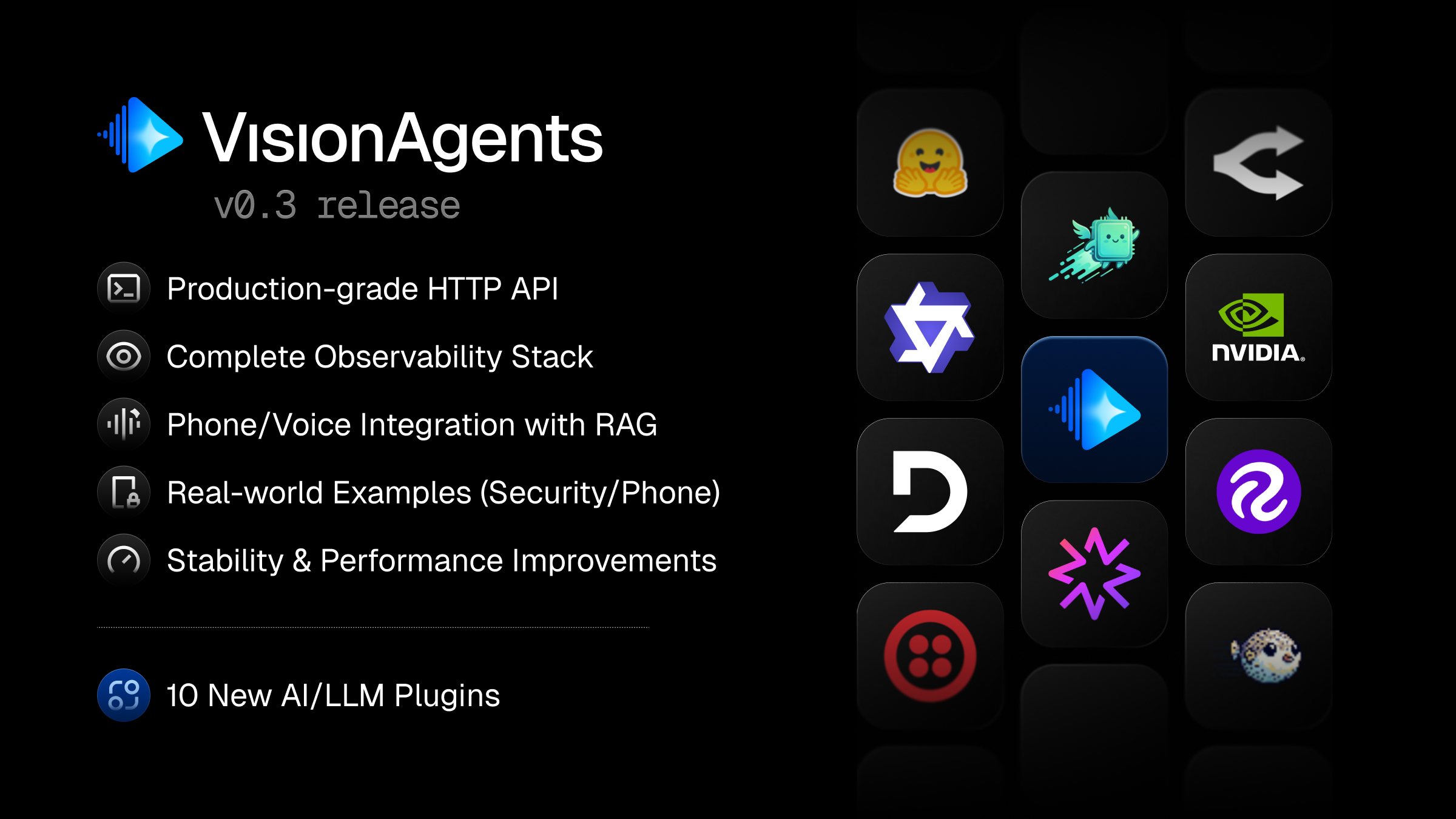 With 10 new plugins spanning AWS, NVIDIA, HuggingFace, and more, plus powerful phone integration and RAG capabilities, v0.3 allows you to build production-grade AI systems that handle everything from customer support calls to yoga instructors.