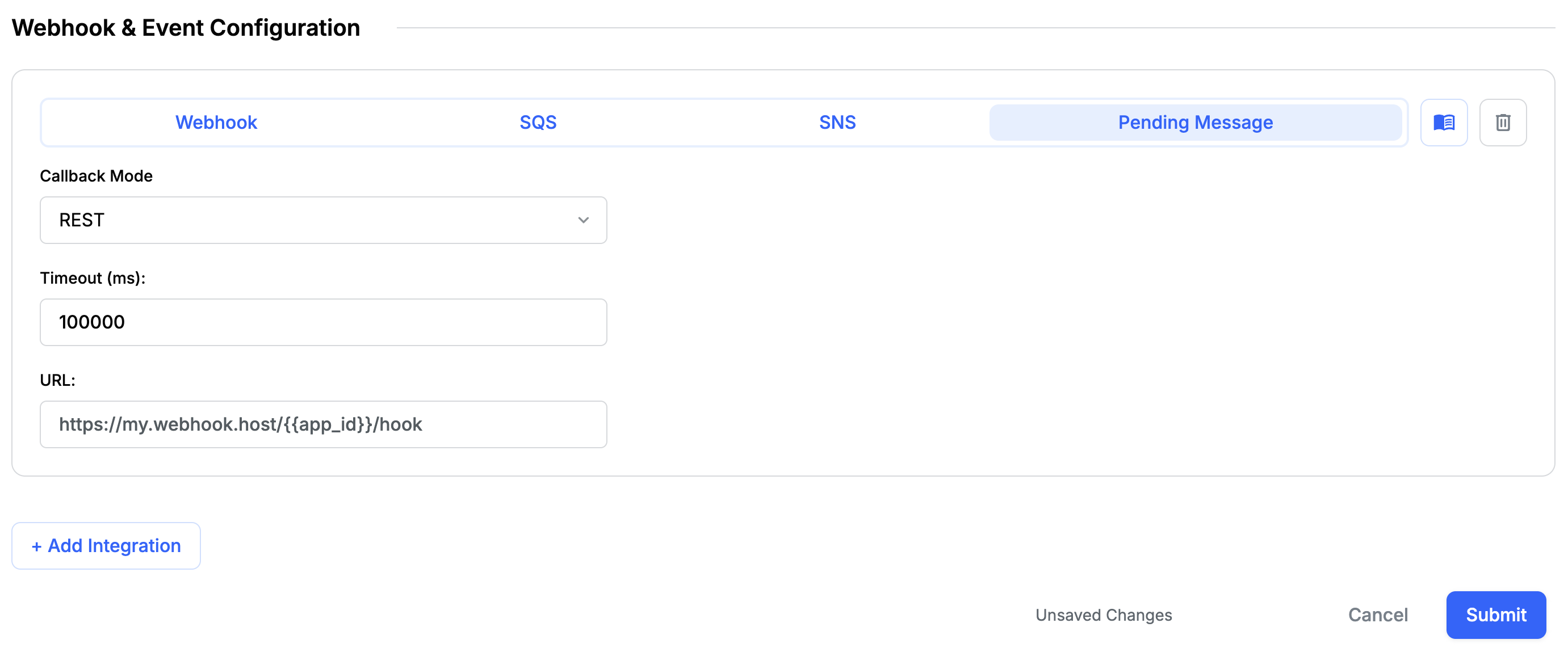 When a pending message is either sent or deleted, the message and its associated pending message metadata are forwarded to your configured callback endpoint via HTTP(s). You may set up to two pending message hooks per application. Only the first commit to a pending message will succeed; any subsequent commit attempts will return an error, as the message is no longer pending. If multiple hooks specify a timeout_ms, the system will use the longest timeout value.