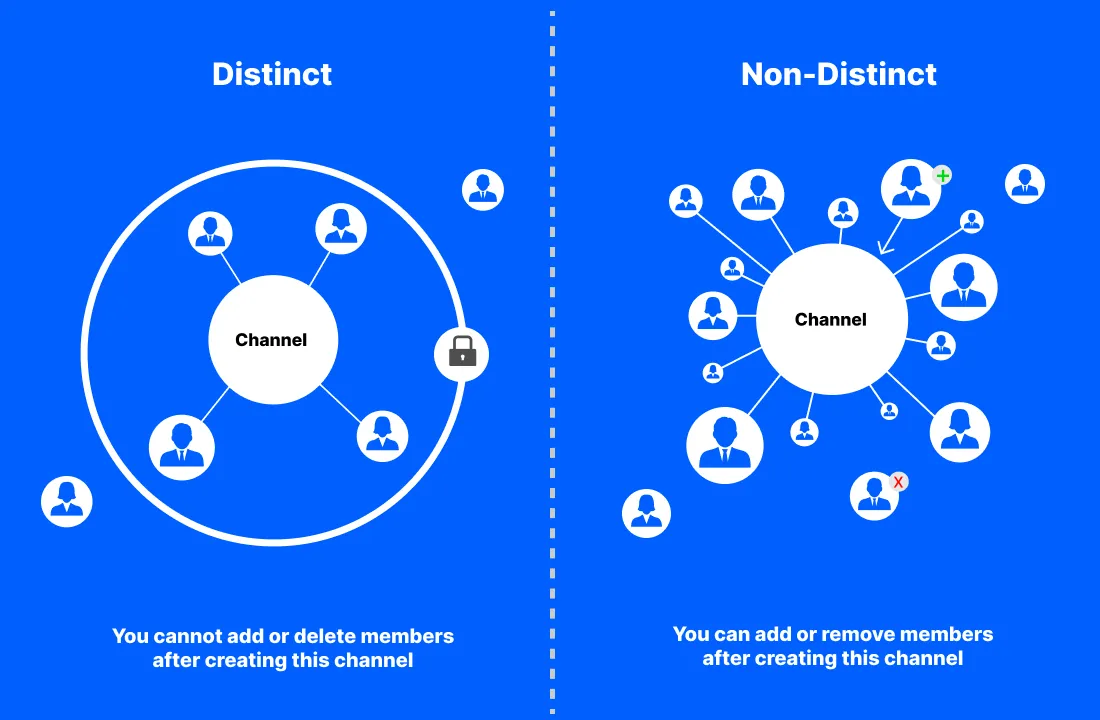 In essence, a normal two-person chat would be a distinct channel created with two members (you cannot add or delete members in this channel), whereas a group created with two people would simply be a non distinct channel (possible to add or remove members).