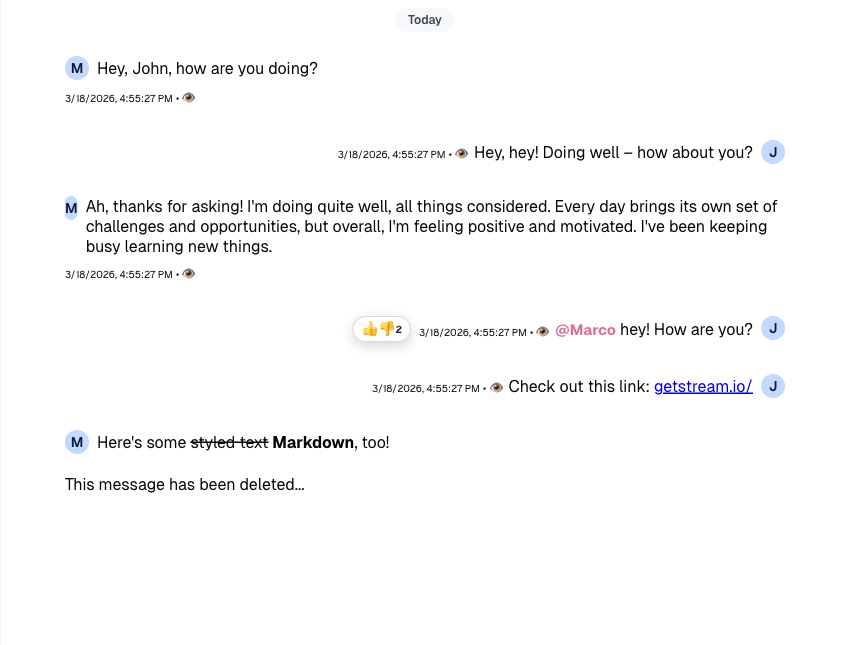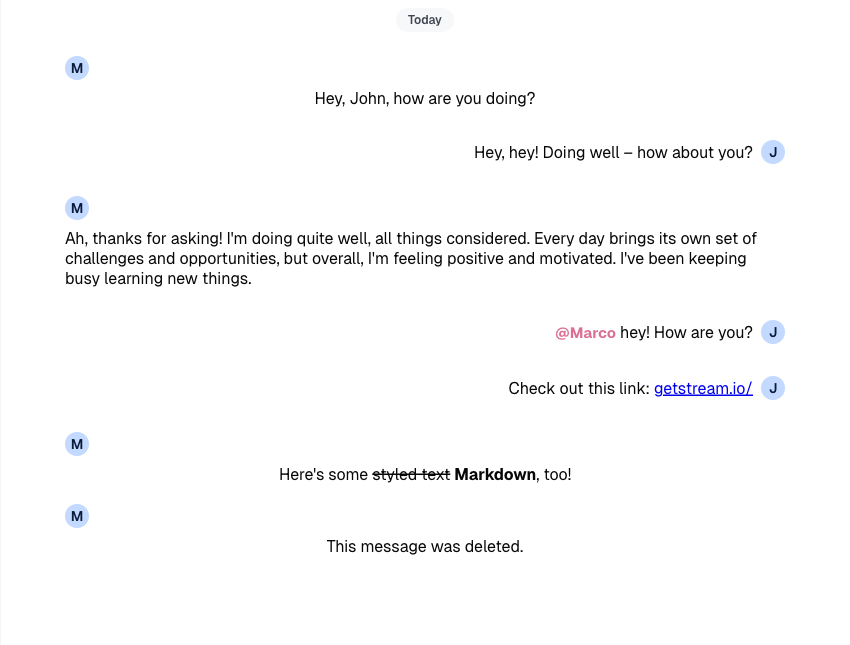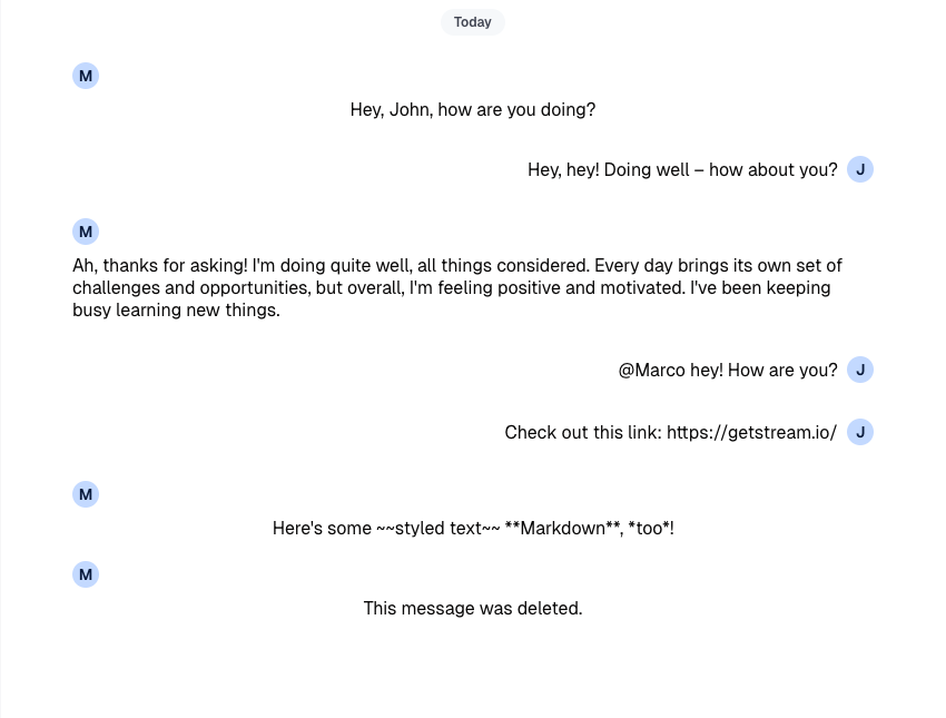 The Message UI component is a core building block of the chat experience. Designing it well is tricky, so the SDK includes a pre-built MessageSimple component that’s easy to customize via CSS variables or component overrides (ComponentContext).