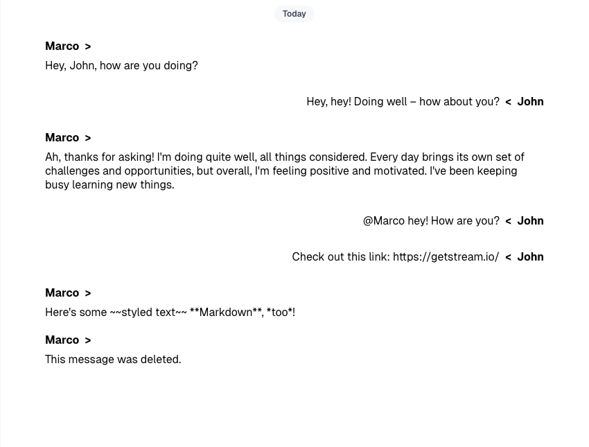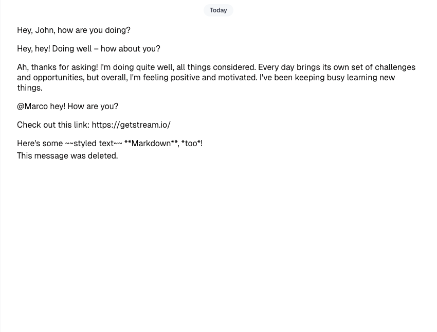 So far we’ve focused on presentation. Beyond mentions and links, there’s little interactivity. Next, we’ll add message actions (delete, reply, pin, etc.) and reactions.