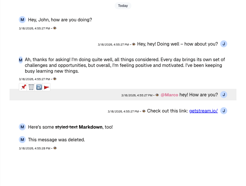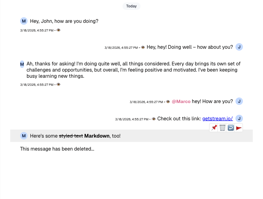 Now that actions are enabled, we also need UI that reflects message state. We already handle the "pinned" state via message.pinned. See the Pin Indicator guide for more options. Let’s cover a few remaining pieces.
